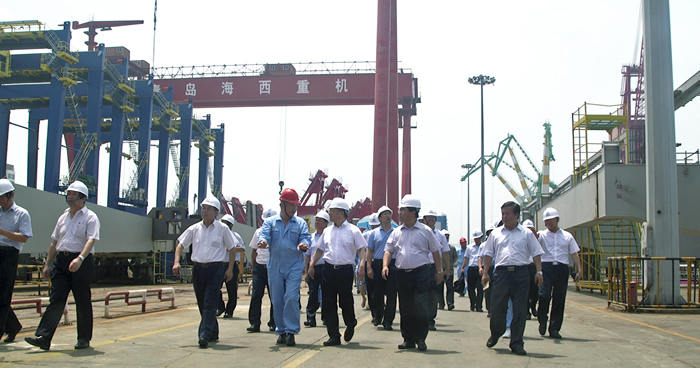 在海西重機總裝現場(chǎng),張德平副市長(cháng)實(shí)地考察了待批量發(fā)往黎巴嫩的岸橋和輪胎吊項目、發(fā)往馬來(lái)西亞的帶斗門(mén)機項目、發(fā)韓國鮮光新港的軌道吊項目及承制、調試的功能性海工平臺項目等。并聽(tīng)取了海西重機董事長(cháng)孫國慶關(guān)于企業(yè)上半年經(jīng)濟運行情況、轉型升級取得的成績(jì)以及在目前經(jīng)濟形勢下的合同承接情況。