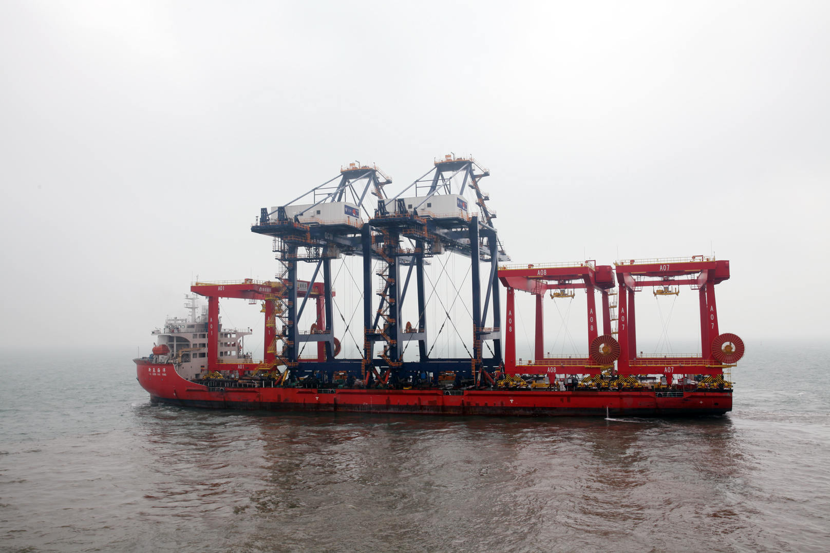 11月5日10時(shí)58分,碼頭現場(chǎng)鞭炮齊鳴,汽笛長(cháng)鳴,伴隨著(zhù)運輸船主機運轉的轟鳴聲,裝載海西重機為寧波舟山港乍浦港區承制的2臺50t-38m岸邊集裝箱起重機(簡(jiǎn)稱(chēng)G216項目)和為日照港集裝箱發(fā)展有限公司承制的第二批3臺自動(dòng)化軌道式集裝箱龍門(mén)起重機(簡(jiǎn)稱(chēng)G219項目)的運輸船緩緩駛離公司碼頭,標志G219項目第二批設備和G216項目順利發(fā)運。