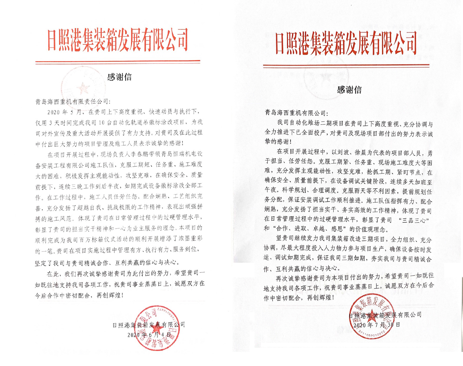 近日,中國船舶集團旗下武漢船機海西重機公司收到兩封來(lái)自日照港集裝箱發(fā)展有限公司的感謝信,字里行間表達了對海西重機在用戶(hù)重要節點(diǎn)中勇于擔當、積極配合、出色完成任務(wù)的表現和付出表示誠摯的感謝,也充分說(shuō)明了用戶(hù)對海西重機產(chǎn)品和服務(wù)的認可。