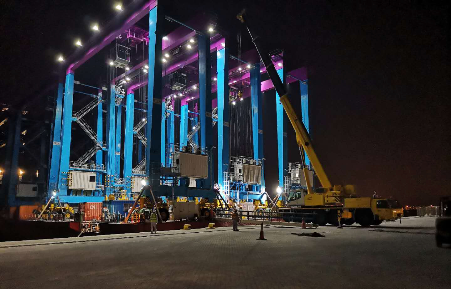 而在7月末發(fā)運的第一批12臺40T輪胎吊經(jīng)過(guò)1個(gè)月的航行到港后,9月初順利完成卸船,擁入新哈馬德港的懷抱。由于業(yè)主方的高層對該項目高度重視,碼頭方有關(guān)人員還在碼頭舉行儀式迎接設備抵港并全程航拍錄像。因項目整體施工策劃得當、安全高效,疫情防控和設備調試并駕齊驅兩不誤,“海西重機”再一次贏(yíng)得了業(yè)主的稱(chēng)贊。