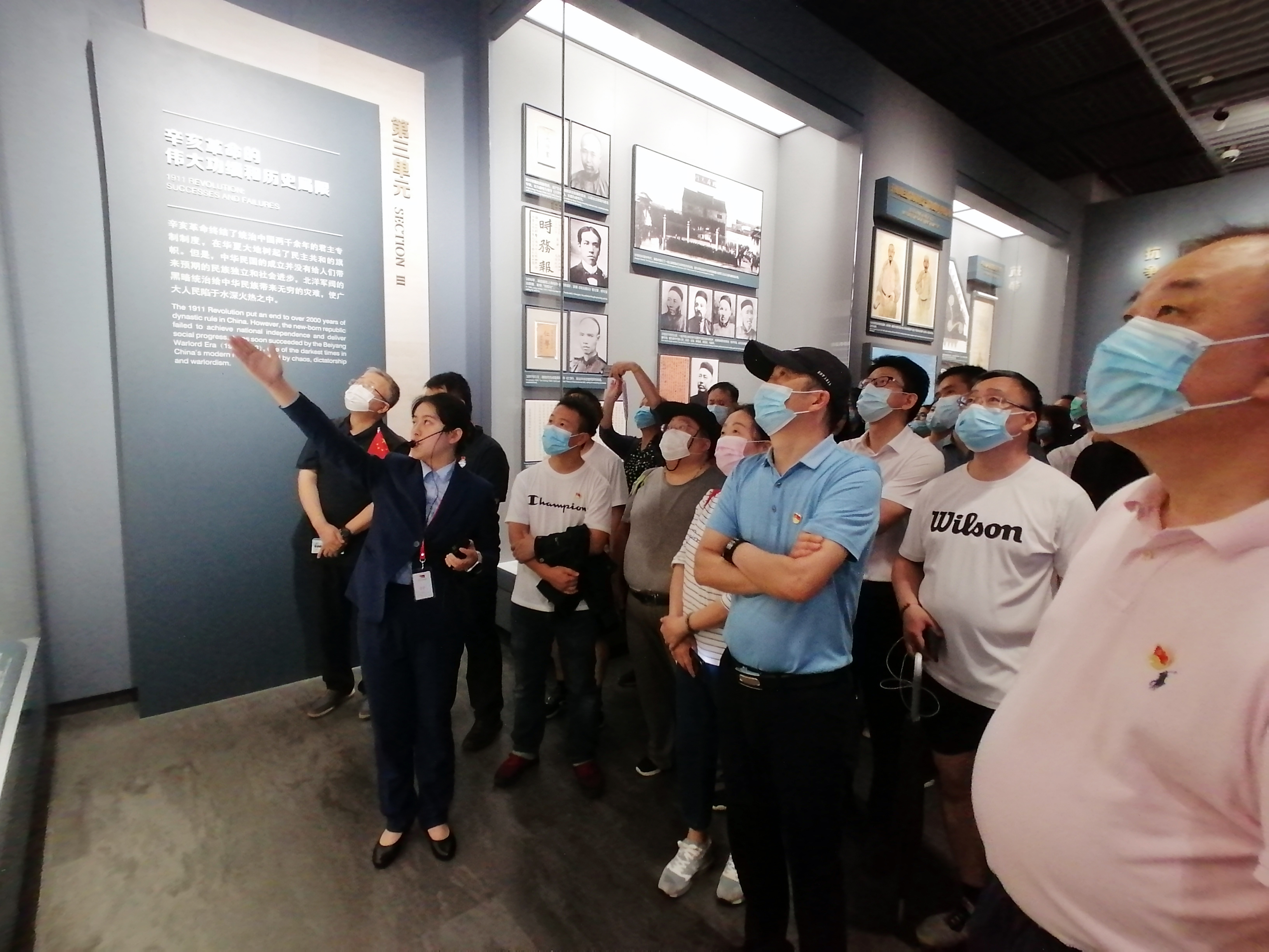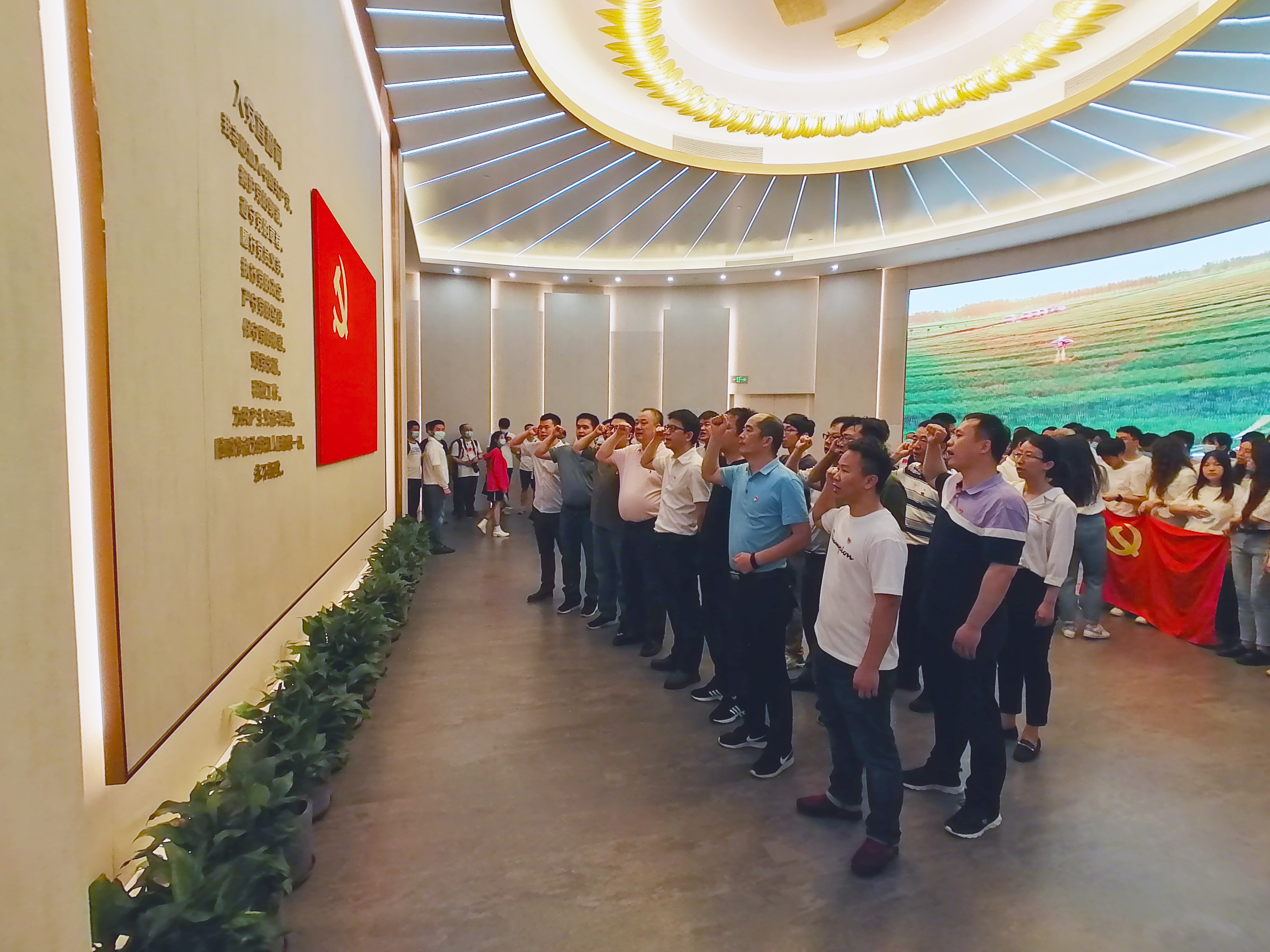 走進(jìn)紀念館,映入眼簾的是一個(gè)巨幅瓷板畫(huà)《日出東方——從石庫門(mén)到天安門(mén)》,畫(huà)面中容納了一大會(huì )址、紅船、井岡山、北京天安門(mén)等革命圣地元素,反映了中國共產(chǎn)黨由小到大、由弱到強的奮斗歷程。進(jìn)入序廳,迎接參觀(guān)者的是主題雕塑《偉大的開(kāi)端》,13位一大代表站在石庫門(mén)前,向我們展示著(zhù)他們的堅定信念和激昂的革命情懷。跟隨講解員,沿著(zhù)展區布景的脈絡(luò )一路參觀(guān)了“前仆后繼、救亡圖存”,“民眾覺(jué)醒、主義抉擇”,“早期組織、星火初燃”,“開(kāi)天辟地、日出東方”,“砥礪前行、光輝歷程”五個(gè)部分,展廳集中呈現了建黨時(shí)期的珍貴文獻、照片、實(shí)物,并以數字化、智能化的方式,立體重現了中國共產(chǎn)黨建黨初期在上海的革命實(shí)踐。大家在銘刻歷史印記的文物實(shí)物,內容詳實(shí)的刊物、圖片、圖表前駐足,在視頻影像和場(chǎng)景還原處停留,仔細聆聽(tīng)講解,用心感悟、感知中國共產(chǎn)黨在上海創(chuàng )建的光榮歷史、奮斗歷程。最后,在宣誓大廳,面對鮮紅的黨旗,朱聲凱帶領(lǐng)大家宣誓,一起重溫入黨誓詞。