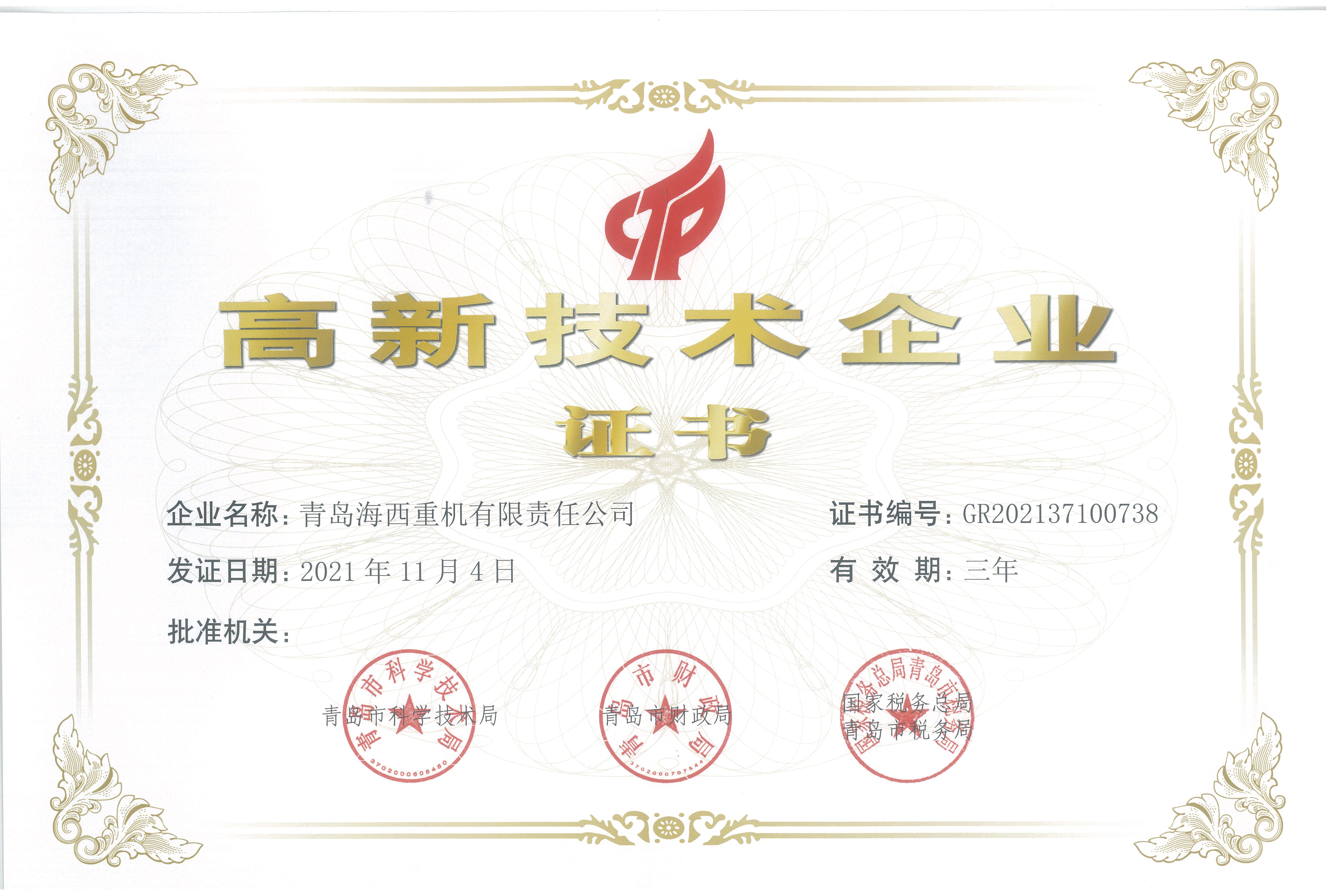 近日,中國船舶集團旗下武漢船機海西重機公司收到由青島市科學(xué)技術(shù)局、青島市財政局、國家稅務(wù)總局青島市稅務(wù)局三部門(mén)聯(lián)合頒發(fā)的《高新技術(shù)企業(yè)證書(shū)》,這是海西重機自2012年首次認定高新技術(shù)企業(yè)以來(lái),第四次通過(guò)高新技術(shù)企業(yè)認定。