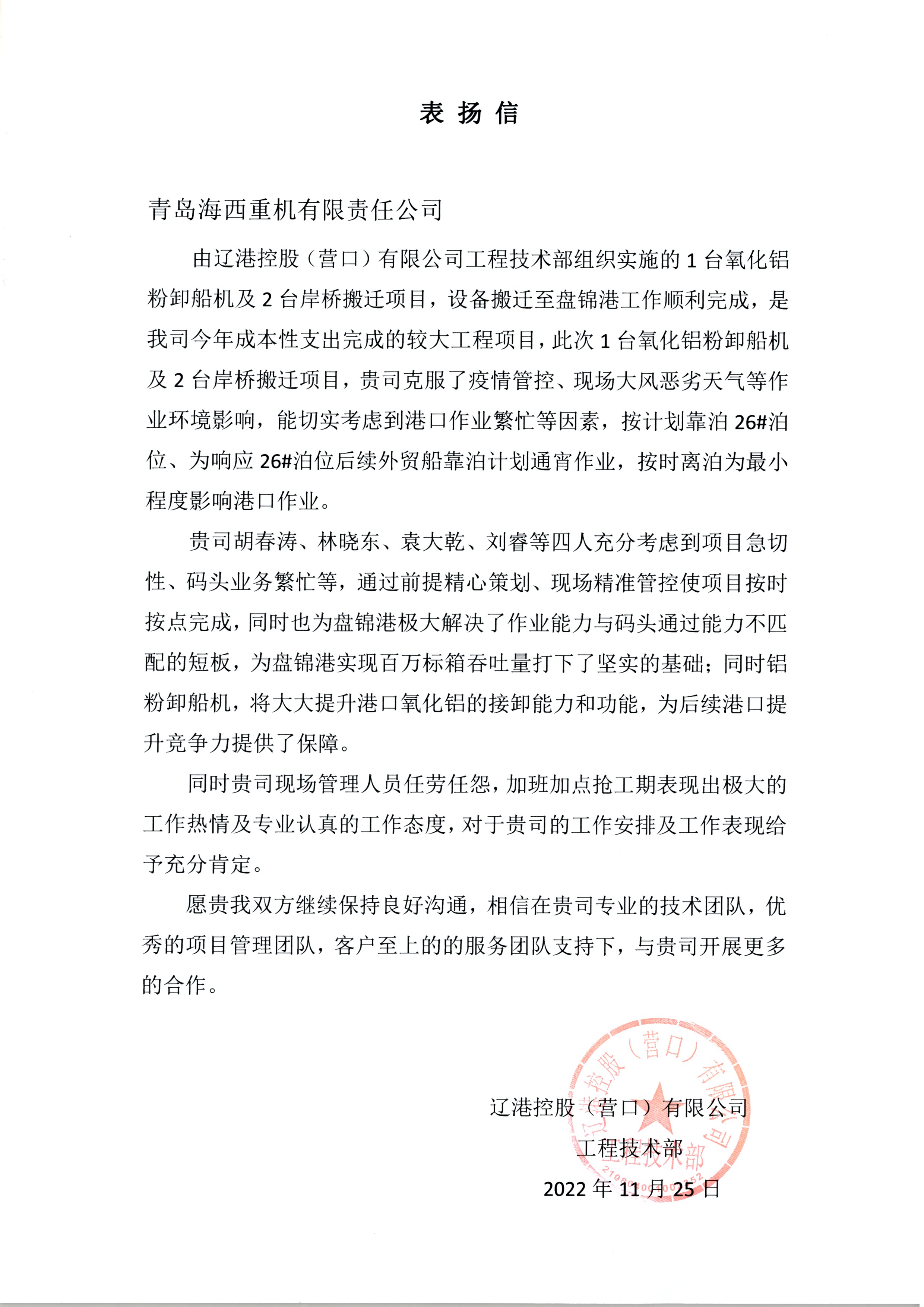 項目施工期間,正值當地疫情防控緊張之時(shí),經(jīng)過(guò)溝通協(xié)調,在遼港控股、盤(pán)錦港集團的大力支持下,特批了綠色通道,提供港內食宿。項目攻關(guān)小組所有人員均食宿在碼頭,克服大風(fēng)、寒潮等惡劣天氣以及疫情帶來(lái)的不利因素,經(jīng)過(guò)20多天的晝夜奮戰,設備最終安全高效、保質(zhì)保量的交付客戶(hù)使用。專(zhuān)業(yè)的人干專(zhuān)業(yè)的事,整個(gè)項目搬遷工作得到了客戶(hù)的充分肯定和贊揚。