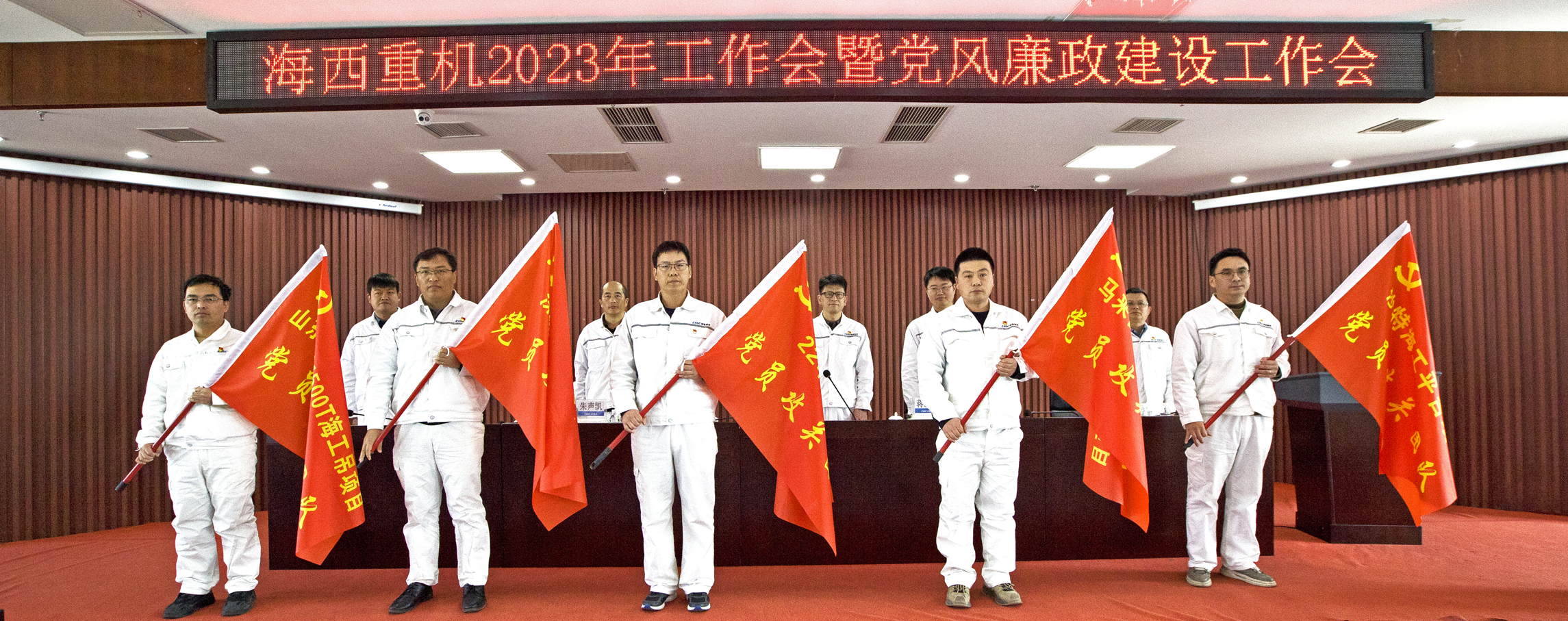 為將黨建工作優(yōu)勢轉化生產(chǎn)經(jīng)營(yíng)工作優(yōu)勢,充分釋放黨建工作“紅利”,進(jìn)一步推動(dòng)黨建工作與生產(chǎn)經(jīng)營(yíng)工作深度融合,針對2023年生產(chǎn)任務(wù)繁忙,會(huì )上還針對山東海洋1500T風(fēng)電安裝平臺1500t起重機項目、深圳大鏟灣項目、550T門(mén)機項目、馬來(lái)西亞古晉港2臺岸橋、沙特海工輔助生活平臺等5個(gè)重難點(diǎn)項目成立黨員攻關(guān)團隊,并開(kāi)展授旗儀式,確保各項任務(wù)保質(zhì)按期完成。