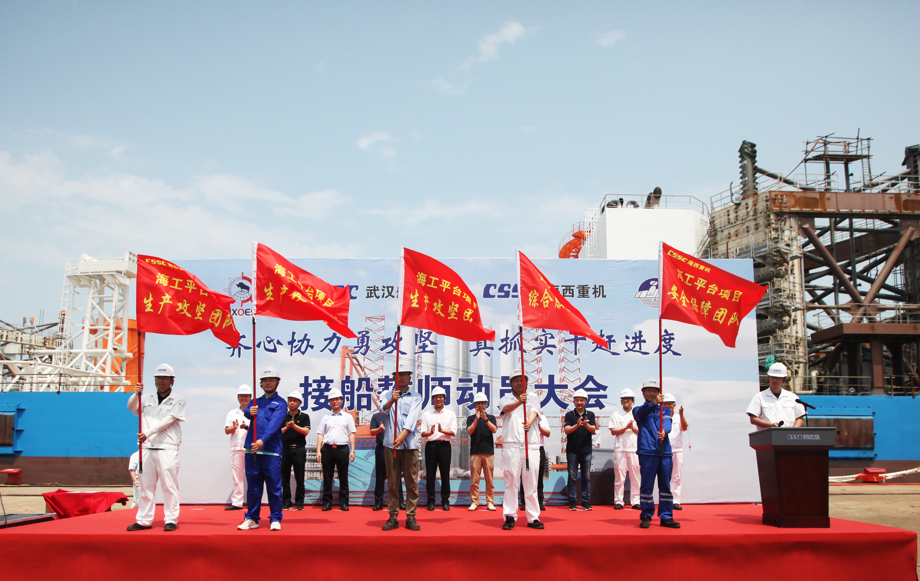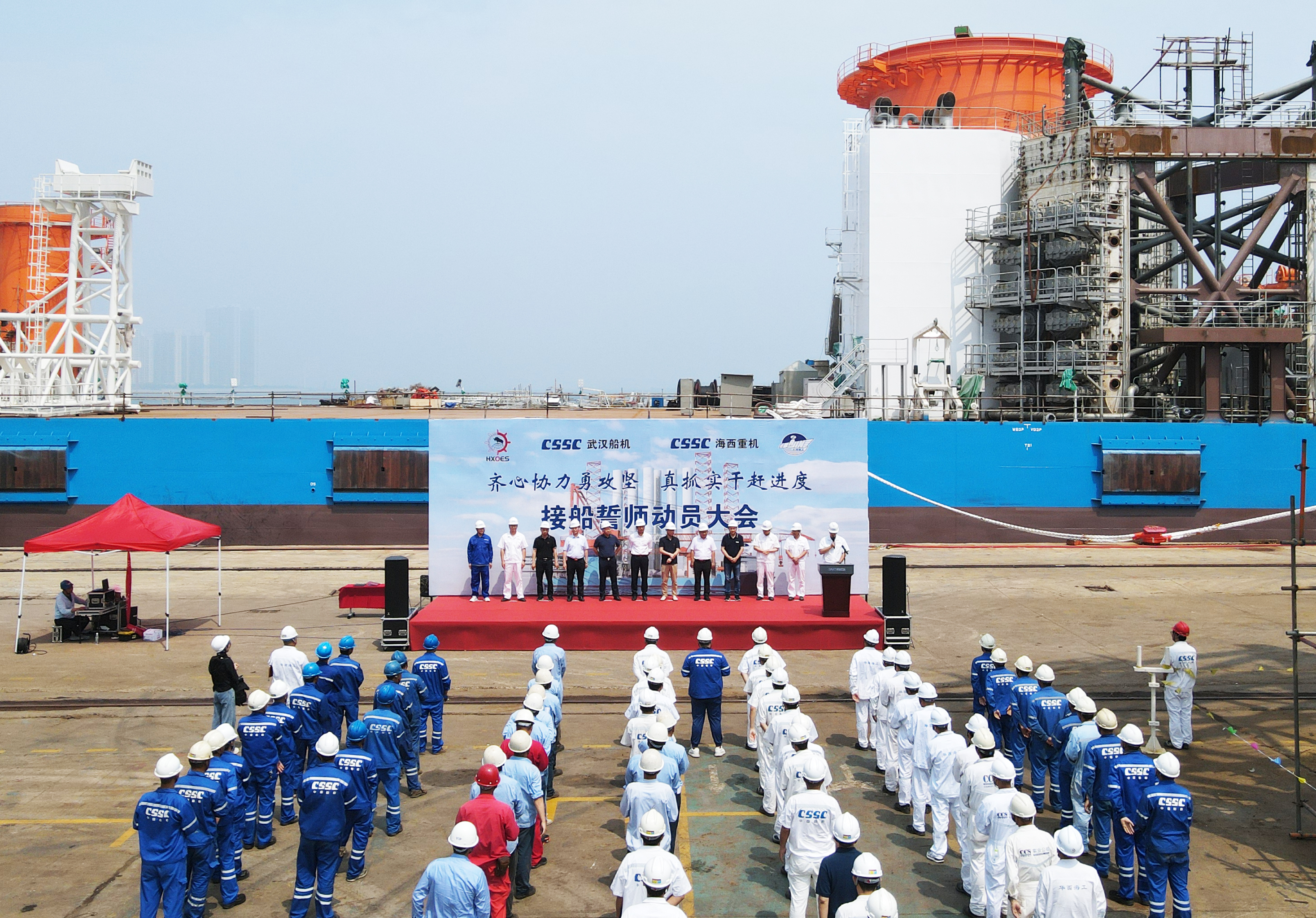 為了明確目標、凝聚共識、齊心協(xié)力、克難攻堅,亮明迎難而上的堅定信心和堅強決心,動(dòng)員全員上下持續營(yíng)造濃厚干事氛圍,掀起“齊心協(xié)力勇攻堅,真抓實(shí)干趕進(jìn)度”的高潮,全力以赴打好海工項目集中攻堅戰,6月27日上午,武漢船機公司在海西重機碼頭生產(chǎn)現場(chǎng)組織開(kāi)展華西海工1600T風(fēng)電安裝平臺接船誓師動(dòng)員大會(huì )。江蘇華西村海洋工程服務(wù)有限公司董事長(cháng)高明、總經(jīng)理吳文勝,武漢船機黨委書(shū)記、董事長(cháng)馬聚勇,副總經(jīng)理孫凱,海西重機黨委書(shū)記、董事長(cháng)李儒新等出席動(dòng)員大會(huì )。江蘇大津重工有限公司總經(jīng)理王友軍、大連船舶重工集團裝備制造有限公司項目經(jīng)理韓濤等相關(guān)領(lǐng)導參加了本次動(dòng)員大會(huì )。