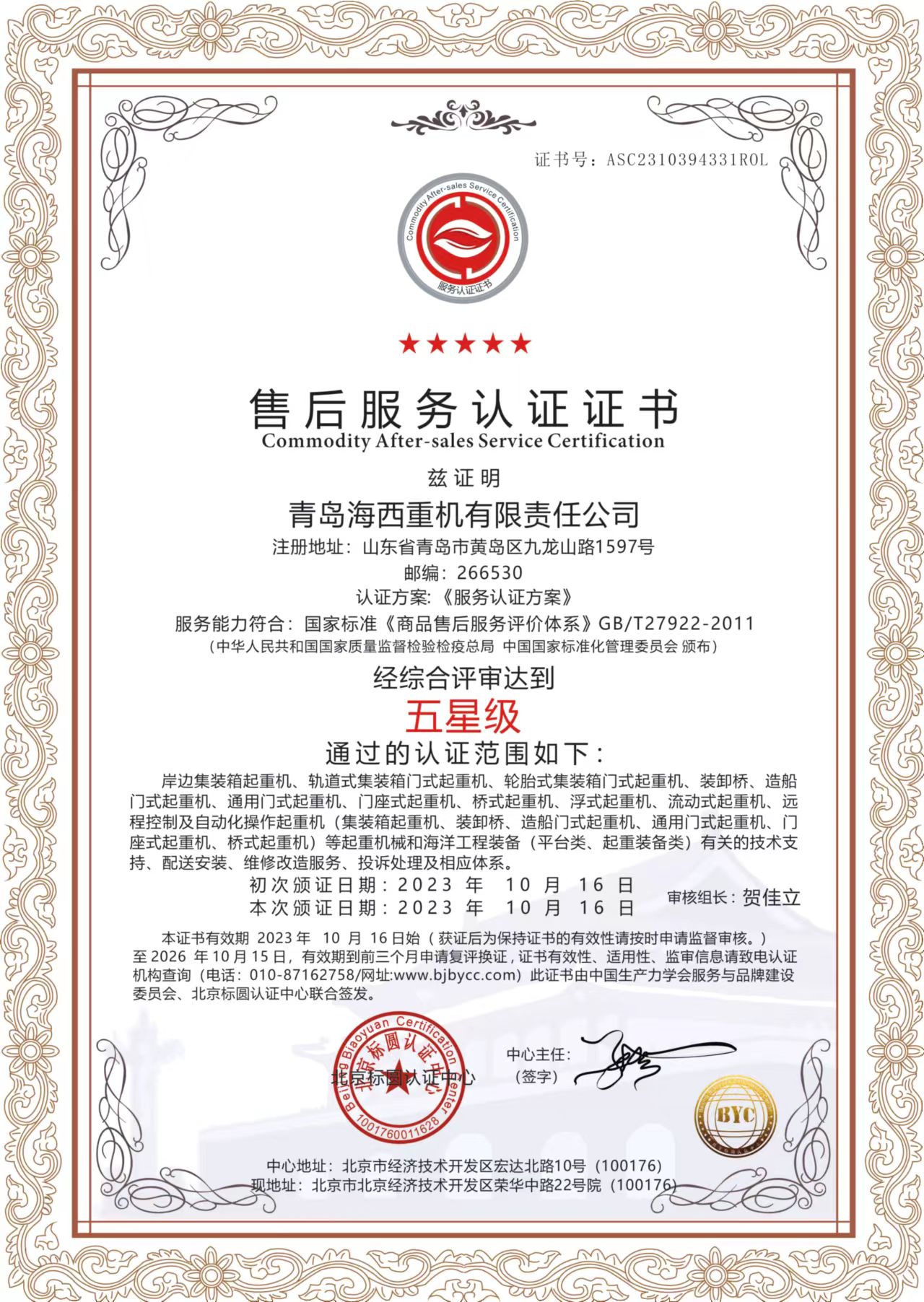 通過(guò)售后服務(wù)體系認證,是對海西重機品質(zhì)追求和服務(wù)能力的有力驗證。海西重機將以此為契機,繼續提升服務(wù)質(zhì)量,為每一位客戶(hù)提供更優(yōu)質(zhì)、更高效、更全面的服務(wù),為客戶(hù)創(chuàng )造更大的價(jià)值。