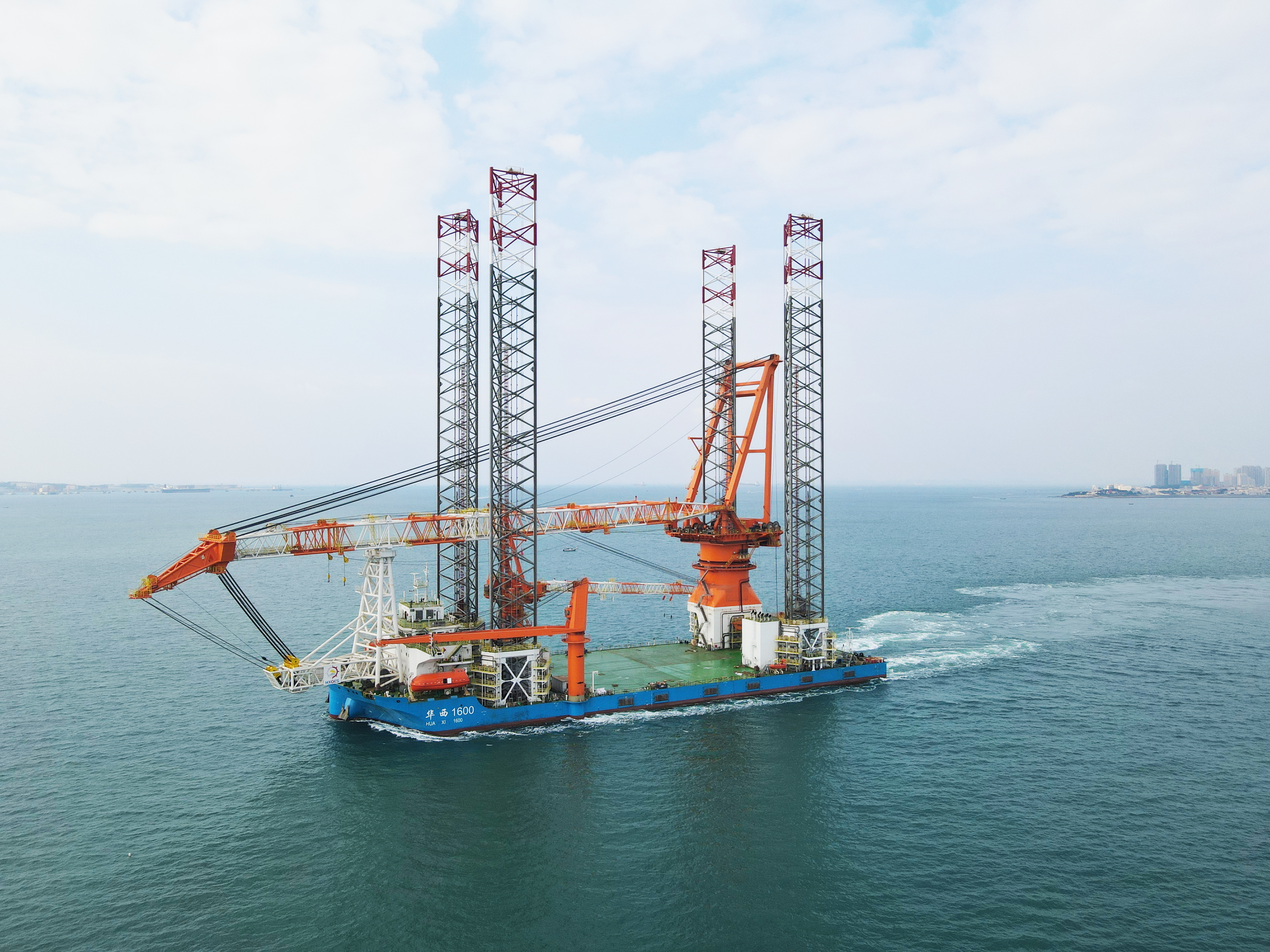 華西海工1600T風(fēng)電安裝平臺項目是武漢船機建造的最新一代風(fēng)電安裝平臺,最大作業(yè)水深70米,主吊機起重能力1600噸,甲板作業(yè)面積相當于11個(gè)籃球場(chǎng),是目前國內作業(yè)水深最大、海上施工能力最強、功能最全、效率最高的桁架式樁腿風(fēng)電安裝平臺。
