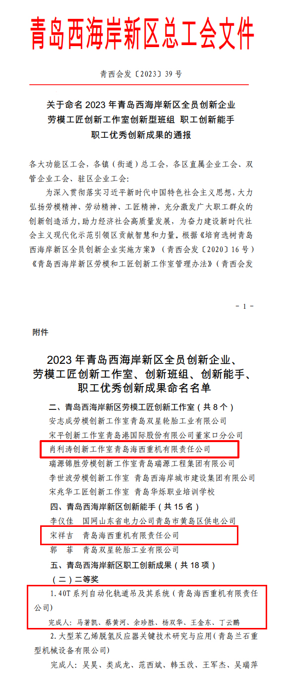此次評選工作由青島西海岸新區總工會(huì )組織開(kāi)展,經(jīng)過(guò)海西重機基層工會(huì )推薦,資料申報、西海岸新區總工會(huì )資格審查、專(zhuān)家組評審,區總工會(huì )現場(chǎng)考察、會(huì )議研究及社會(huì )公示等環(huán)節,最終“肖利濤創(chuàng )新工作室”榮獲西海岸新區“勞模工匠創(chuàng )新工作室”榮譽(yù)稱(chēng)號,位居同類(lèi)第三;“40T系列自動(dòng)化軌道吊及其系統(完成人:馬著(zhù)凱、蔡黃河、余珍勝、楊雙華、王金東、丁云鵬)”榮獲西海岸新區“職工創(chuàng )新成果”二等獎;宋祥吉同志脫穎而出,榮獲西海岸新區“職工創(chuàng )新能手”榮譽(yù)稱(chēng)號。