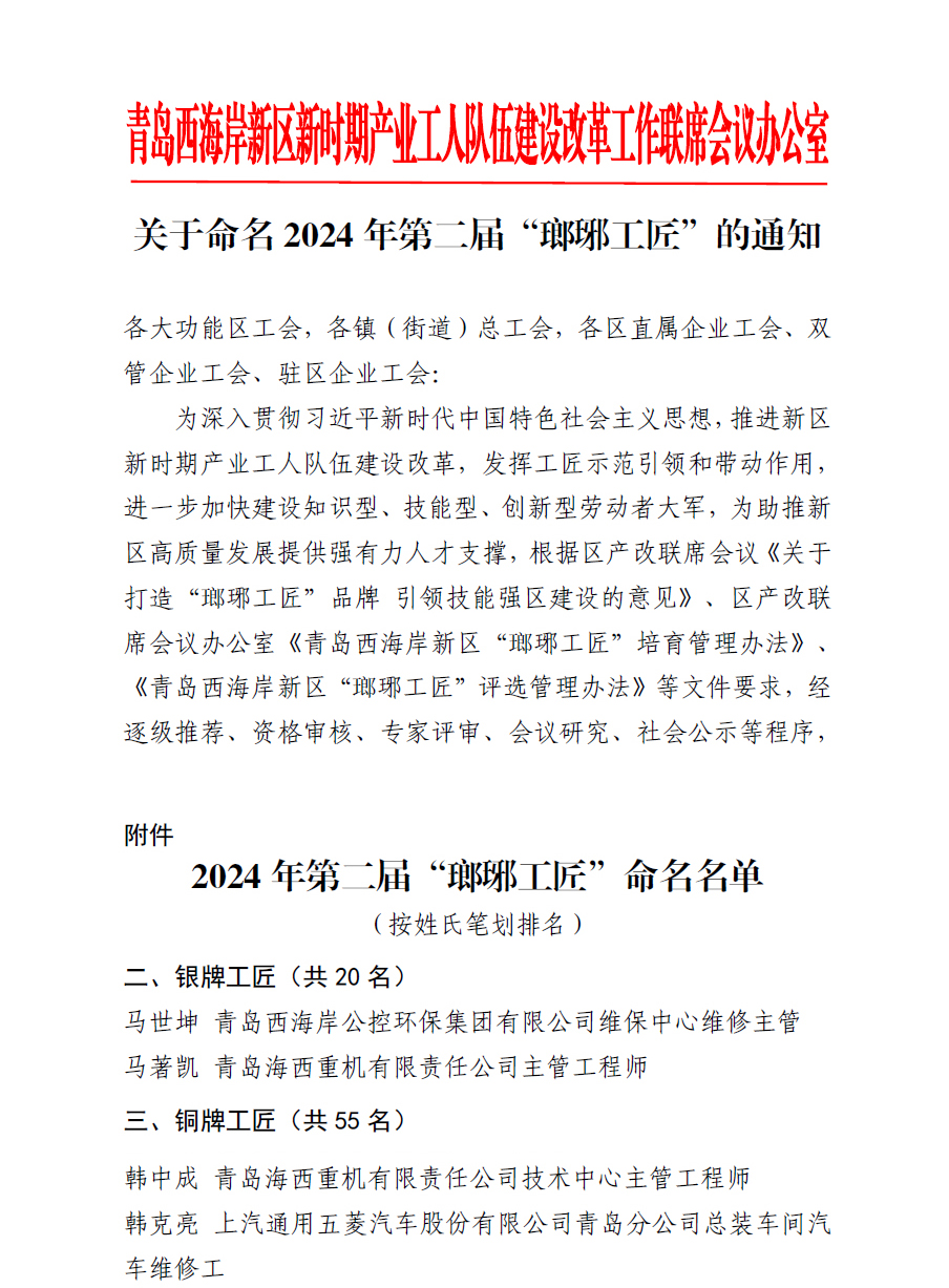 為深入貫徹習近平新時(shí)代中國特色社會(huì )主義思想,推進(jìn)新區新時(shí)期產(chǎn)業(yè)工人隊伍建設改革,發(fā)揮工匠示范引領(lǐng)和帶動(dòng)作用,進(jìn)一步加快建設知識型、技能型、創(chuàng )新型勞動(dòng)者大軍,為助推新區高質(zhì)量發(fā)展提供強有力人才支撐,根據區產(chǎn)改聯(lián)席會(huì )議《關(guān)于打造“瑯琊工匠”品牌引領(lǐng)技能強區建設的意見(jiàn)》、區產(chǎn)改聯(lián)席會(huì )議辦公室《青島西海岸新區“瑯琊工匠”培育管理辦法》、《青島西海岸新區“瑯琊工匠”評選管理辦法》等文件要求,經(jīng)逐級推薦、資格審核、專(zhuān)家評審、會(huì )議研究、社會(huì )公示等程序,最終100 名同志脫穎而出,入選新區第二屆“瑯琊工匠”。