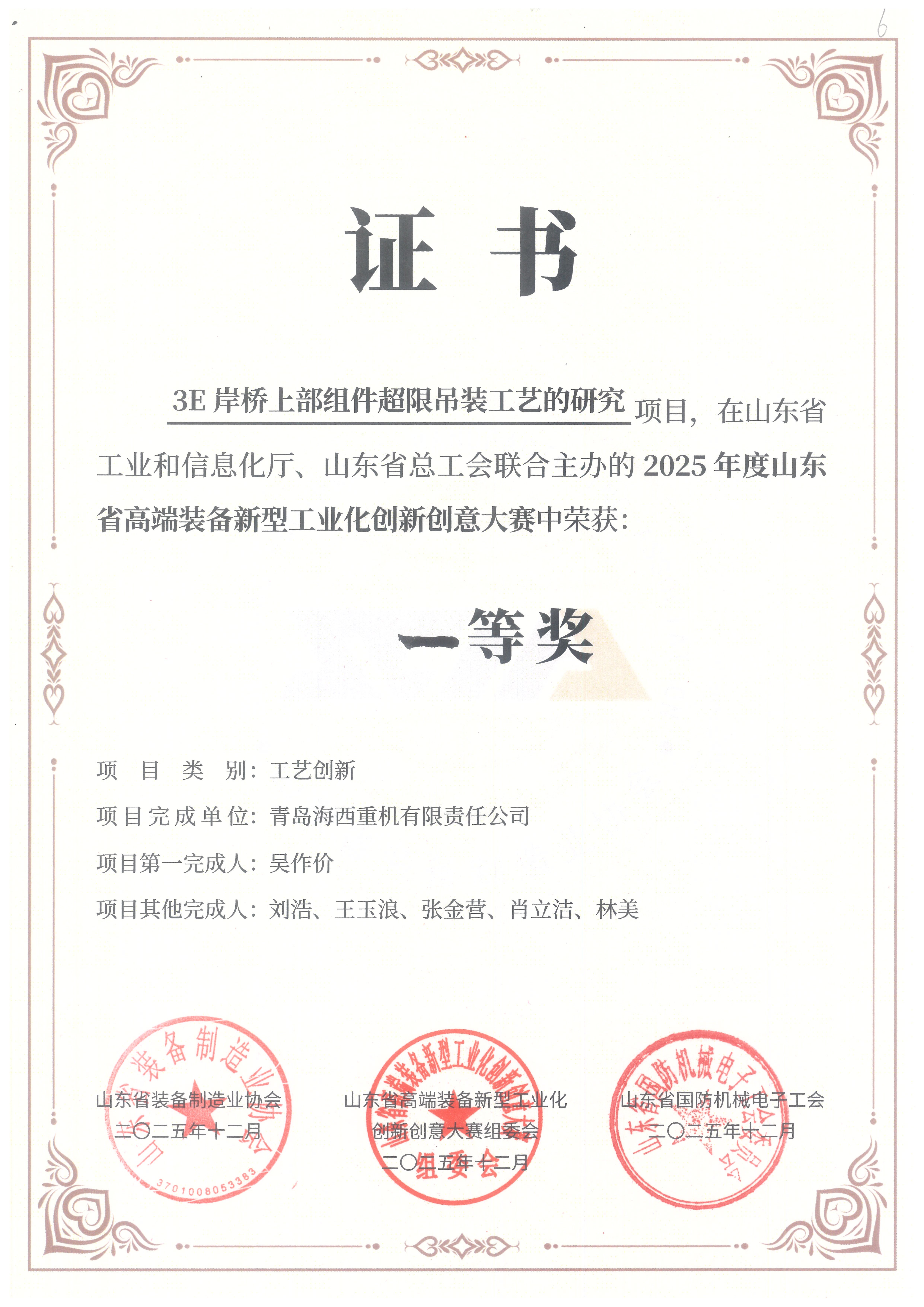 “3E岸橋上部組件超限吊裝工藝的研究”——工藝創(chuàng )新一等獎