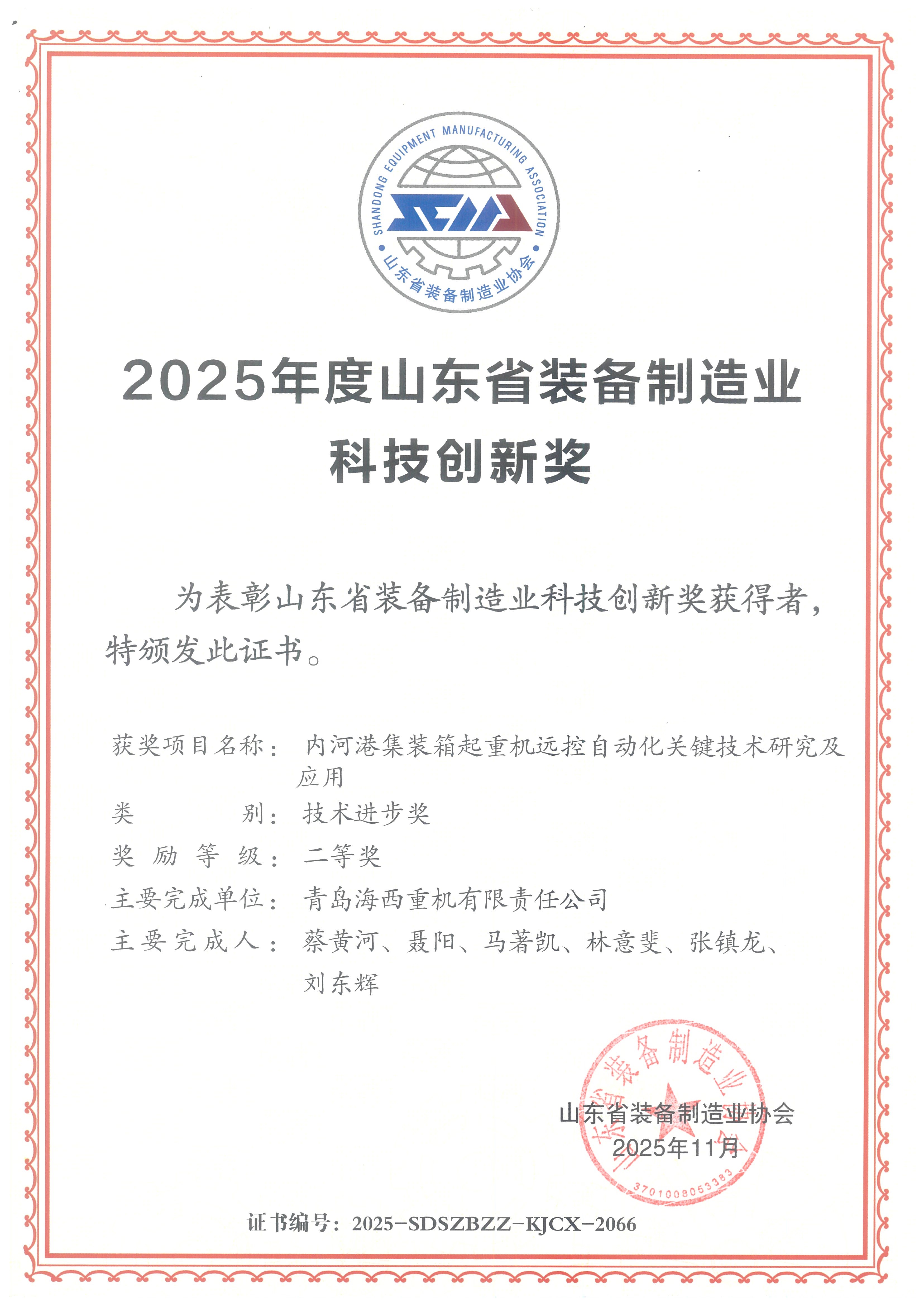 “內河港集裝箱起重機遠控自動(dòng)化關(guān)鍵技術(shù)研究及應用”——科技創(chuàng )新獎二等獎