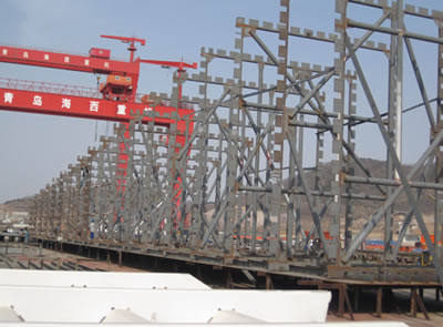 天津新港600T造船龍門(mén)吊是青島海西重機有限責任公司承接的第一臺大型龍門(mén)起重機,合同總額1.05億元,是公司關(guān)鍵項目。公司領(lǐng)導高度重視,專(zhuān)門(mén)成立了以公司總經(jīng)理為組長(cháng)的項目組,在全公司實(shí)施精品戰略,本著(zhù)“作一臺設備,占一片市場(chǎng),交一個(gè)朋友”的宗旨,從聯(lián)合設計到注重制造的每一個(gè)細節,海西重機都組織了多次討論,全力保證產(chǎn)品質(zhì)量。