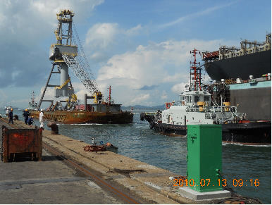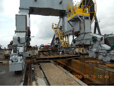 2010年7月15日,我公司為香港聯(lián)合船塢集團有限公司(HUD)承制的MQ5050門(mén)座起重機到達香港HUD公司碼頭并安全滾裝上岸。該門(mén)機采用臺車(chē)輔助、整機滾裝、整體捆扎、拖輪加平板駁船的運輸方式,從青島至香港航次歷時(shí)8天。