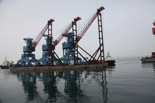 2012年8月17日,3臺單臂架門(mén)座式起重機(型號:MQ25t-35m)離開(kāi)我司碼頭,駛向印尼第二港務(wù)集團公司。