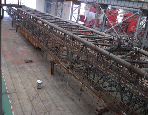 500T全回轉固定吊臂架長(cháng)110米,寬6.5米,高5米,重達200余噸。自接到生產(chǎn)任務(wù)以來(lái),針對該項目生產(chǎn)任務(wù)緊、制作周期短、難度大等特性,鋼構部統籌部署,多管齊下,確保項目進(jìn)展。首先以節點(diǎn)實(shí)現率為重點(diǎn),細化施工隊、焊工隊節點(diǎn)考核,嚴格執行;其次考慮技術(shù)熟練程度和連續性,所有施工及管理人員均采用3600T浮吊臂架原班人馬,各工種24小時(shí)不間斷作業(yè),全力推進(jìn)項目進(jìn)展;第三各負責調度、檢驗人員、工藝人員等各司其職、齊心協(xié)力,監管措施到位,工序銜接順暢,確保臂架各分支計劃穩步推進(jìn)。在各項有效措施的保障下,在工藝部和品質(zhì)部的全力配合下,該臂架制作歷時(shí)不到40天,制作周期較同類(lèi)型吊臂架縮短了一倍以上,且一次探傷合格率達98.5%,結構質(zhì)量和外觀(guān)成型得到了業(yè)主的一致認可和表?yè)P,創(chuàng )造了鋼構部制作行架結構件的奇跡!