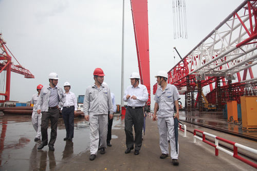 在參觀(guān)公司現場(chǎng)建成自用的1600噸龍門(mén)吊項目、正在吊裝上船的3600噸全回轉浮吊項目、面對公司的120米突堤碼頭以及繁忙的生產(chǎn)組裝現場(chǎng),董總對公司的經(jīng)營(yíng)發(fā)展態(tài)勢予以充分肯定。他說(shuō):在當前市場(chǎng)經(jīng)濟低迷的形勢下,青島海西重機能夠抓住發(fā)展機遇,逆勢而上,尤其在技術(shù)創(chuàng )新和產(chǎn)品開(kāi)發(fā)方面發(fā)揮了自身潛能,具有前瞻性和市場(chǎng)眼光,更是武漢船機公司在船市低迷的情況下,產(chǎn)品結構調整的有力體現。董總特別對近期在煙臺、連云港、海南洋浦等港口項目投標中,我司與上海振華同臺競標并連續奪得標的給予了高度肯定。
