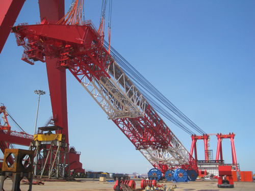 8月18日下午,青島海西重機在自己的突堤碼頭內順利完成3600t浮吊1#臂架的最后吊裝。至此,3600t浮吊臂架安裝、鋼絲繩纏繞、臂架拉起的三步驟吊裝均已勝利完工。該臂架總重1200T,長(cháng)130M,寬24米,高10米,是典型超長(cháng)、超大、超重件,通過(guò)對國內首創(chuàng )的突堤碼頭和自制1600t龍門(mén)吊的完美組合使用,海西重機自主創(chuàng )新以獨特的方式攻克了超大型構件的吊裝以及吊裝中動(dòng)態(tài)傾斜安裝的技術(shù)難題,突破了浮吊加駁船安裝浮吊的傳統安裝方式,降低了安裝成本,使施工安裝風(fēng)險得到充分可控,施工周期也大大縮短。