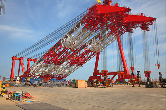 第一次穿繞超特長(cháng)起重鋼絲繩:產(chǎn)品鋼絲繩直徑54mm、單根長(cháng)度7000米(共4根),單套引繩12000米,合計數萬(wàn)米的鋼絲繩通過(guò)兩套牽引設備在空中相距300米的60個(gè)滑輪之間來(lái)回穿梭,猶如巨龍在空中盤(pán)旋,空中曲線(xiàn)優(yōu)雅而美麗。利用海西重機突堤碼頭和1600t龍門(mén)吊的完美組合、設計獨特的工裝和工藝方案成功實(shí)現3600t浮吊的安裝,在海西重機是第一次,在國內也屬首創(chuàng )。